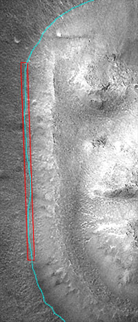 I would also argue that this analysis applies equally well to curved edges that follow mathematical properties, e.g. an arc of a circle or a segment of an ellipse. For example, if the perimeter of an elliptical edge were 20 times the maximum deviation perpendicular to the direction of the edge, then it would be just as likely to occur in nature as a straight edge with a similar ratio. Again, this would not apply to naturally occuring circles, such as craters, but, rather, to protruding objects like mountains that follow random edge properties. HOW STRAIGHT/SMOOTH (IMPROBABLE) IS THE FACE? Now we can ask the question: How straight or smooth is the outline of The Face? To do this, I took the April 2001 MGS image shown in Figure 3 above, as it has the best resolution and therefore the most well defined edges. Figure 9a shows a closeup of The Face. In Figure 9b, I traced the outline of the border as closely as I could. Figure 9c shows how this outline compares to an approximate border composed of straight lines and segments of an ellipse. |